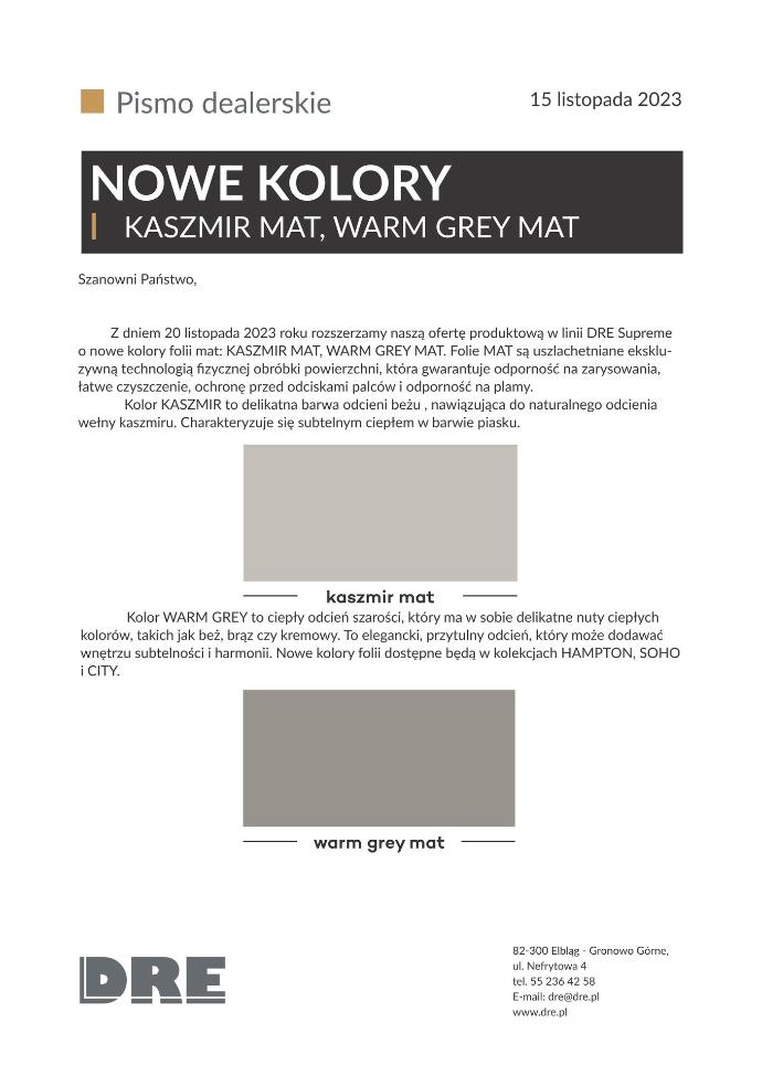 o nowe kolory folii mat: KASZMIR MAT, WARM GREY MAT. Folie MAT są uszlachetniane ekskluzywną technologią fizycznej obróbki powierzchni, która gwarantuje odporność na zarysowania, łatwe czyszczenie, ochronę przed odciskami palców i odporność na plamy.